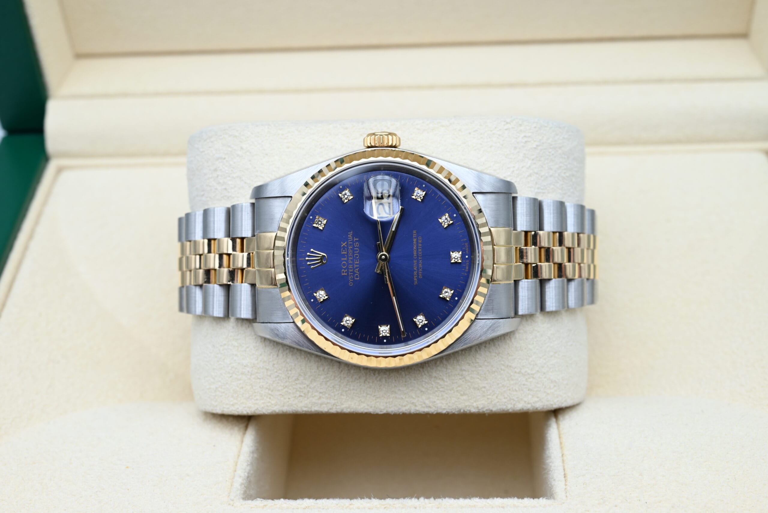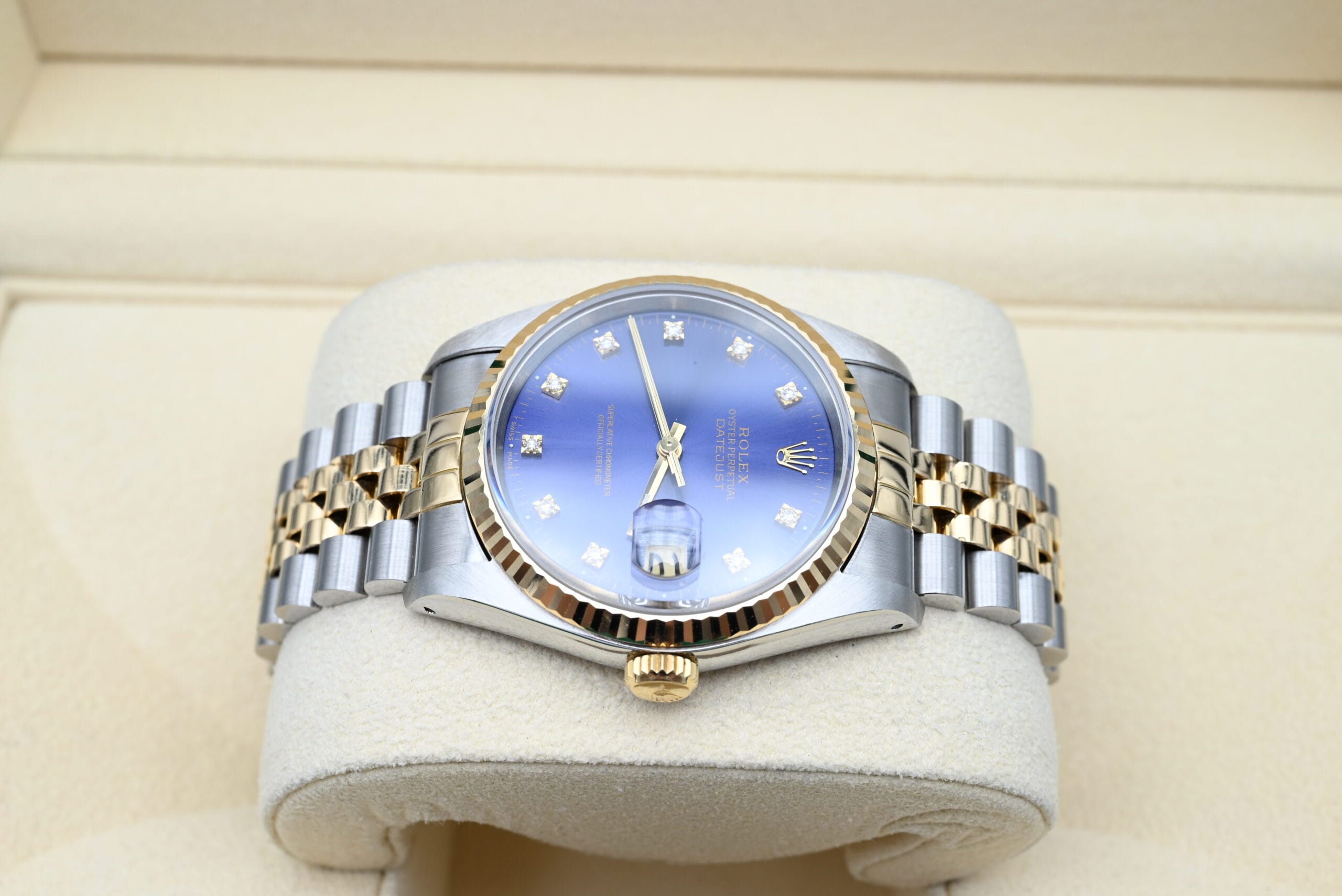 Rolex Datejust Ref. 16233 from 1992 with the blue diamond dial in excellent condition, comes complete with the full set.
